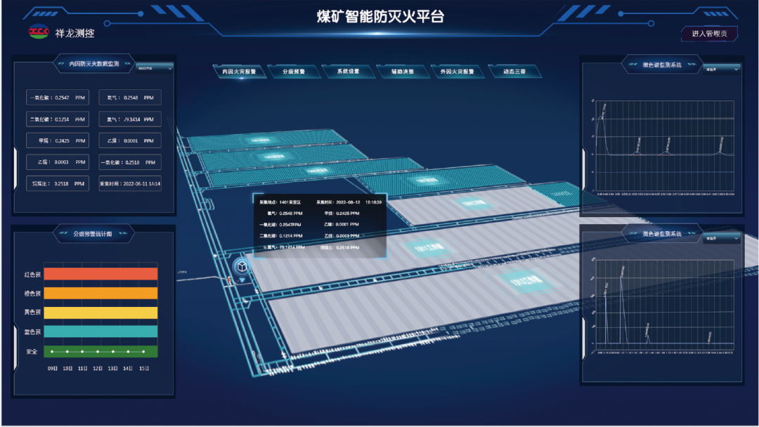 祥龙测控煤矿智能防灭火平台建设,充分利用新一代信息创新技术,有效实现整合矿井注氮机、喷淋系统等灭火设备,基于火灾分析模型实现对井下火灾的智能化干预控制及辅助决策,贯通各类火灾监测系统的设备互联、数据互通、融合创新,建立起煤矿井下火灾的全方位立体化监控体系,实现井下内外因火灾的发火趋势分析、智能预警预报,实现煤矿关键地点、重点部位重大安全风险的实时识别、监测和精准研判。为以遏制煤矿重特大事故为目标,防范和化解重大安全风险,提升矿山数字化、智能化安全生产水平做出积极贡献,受到国家能源局验收专家一致好评。