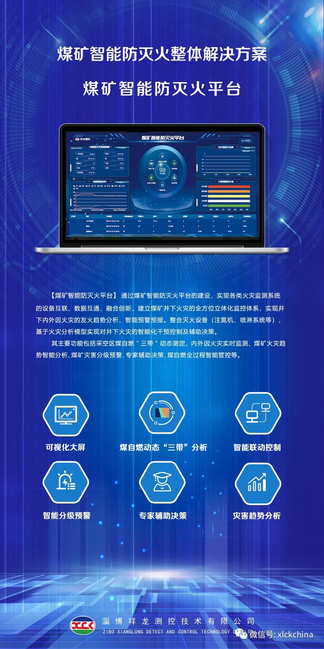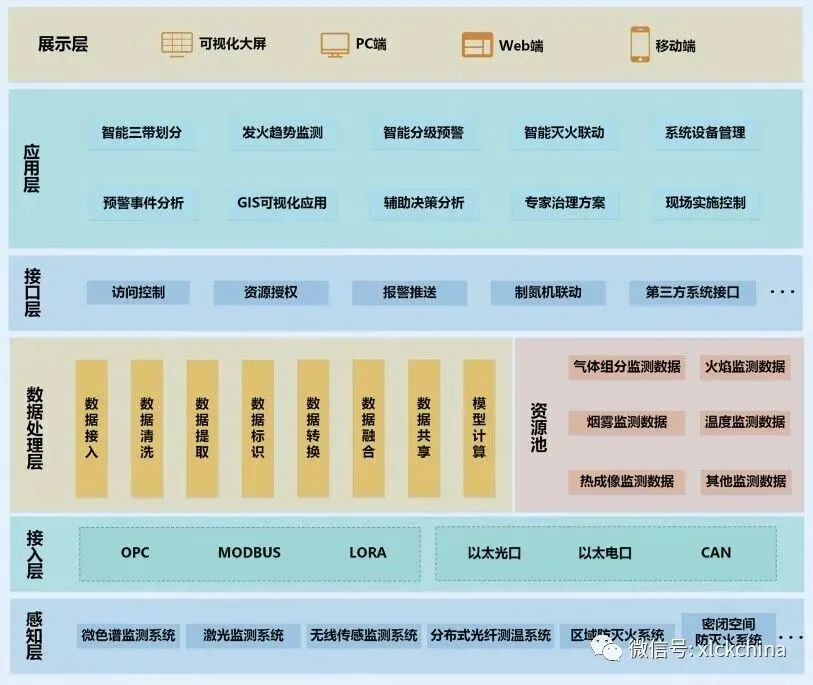 祥龙测控自主设计、研发的煤矿智能防灭火平台,依据国家能源局、国家矿山安全监察局印发的《煤矿智能化建设指南(2021年版)》“多系统互联、智能感知监测、智能分析预警、智能干预控制”的要求建设,由内因火灾监测系统、外因火灾监测系统、平台主机、分析控制软件和火灾控制设备等组成,有效将煤矿火灾监测数据进行对接、整合、分析、预测、联动控制,采用感知层、接入层、资源池、数据处理层、接口层、应用层、展示层分层模式架构设计,通过SOA(面向服务管理架构)模式实现应用组件的有效整合,完成系统的统一化设计与管理。具有高内聚、低耦合、稳定可靠等技术特点。