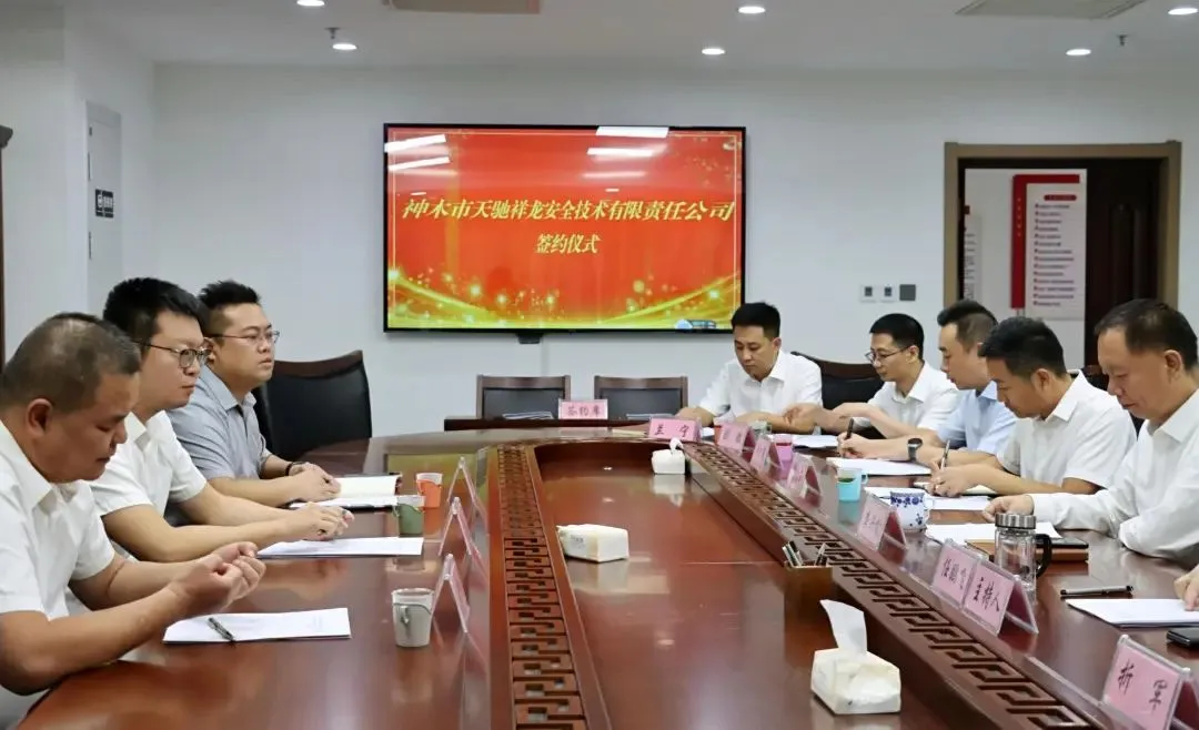 9月11日下午,神木市天驰祥龙安全技术有限责任公司(以下简称天驰祥龙公司)签约仪式暨首次股东会、一届一次董事会会议在集团公司隆重举行。神木市工矿商贸集团公司(以下简称工贸集团)股东代表龚兴榆与淄博祥龙测控技术有限公司(以下简称祥龙测控公司)股东代表白光星出席会议并讲话,相关领导、部门负责人列席会议,神木市工矿商贸集团公司副董事长任鹏飞主持会议。